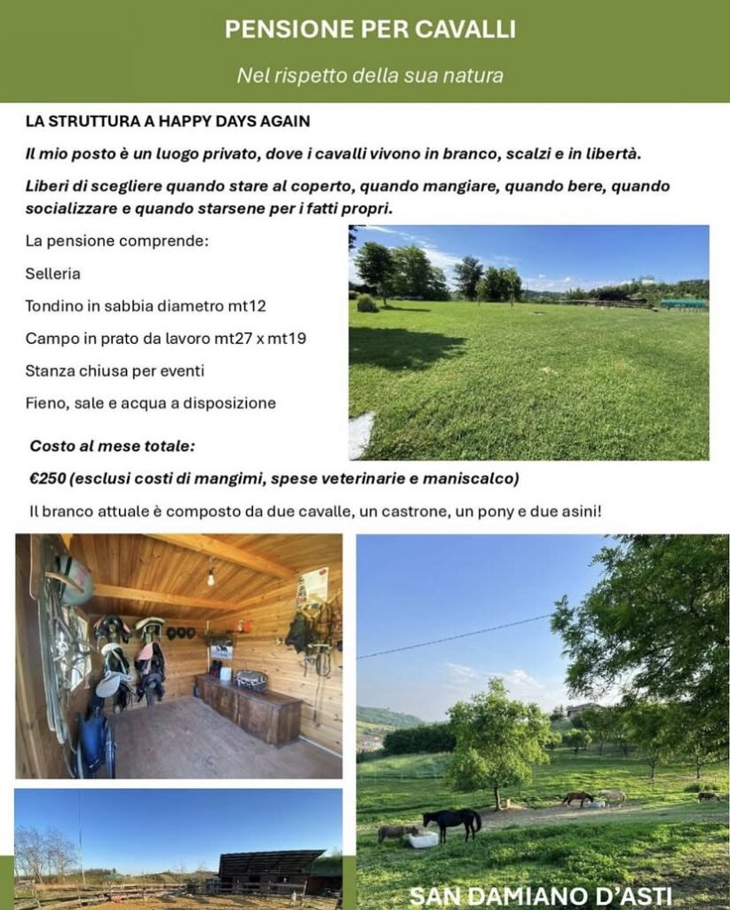 Tra Asti e Alba, do la possibilità di ospitare in pensione cavalli in gestione naturalizzata.